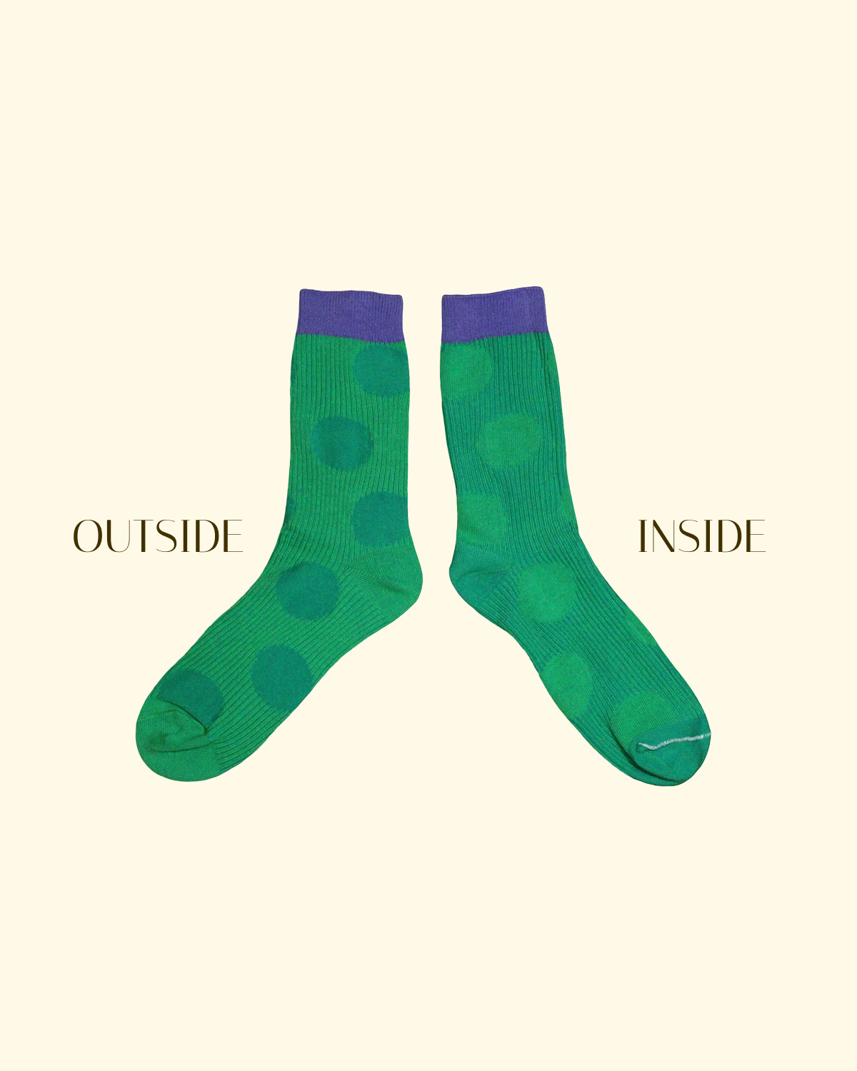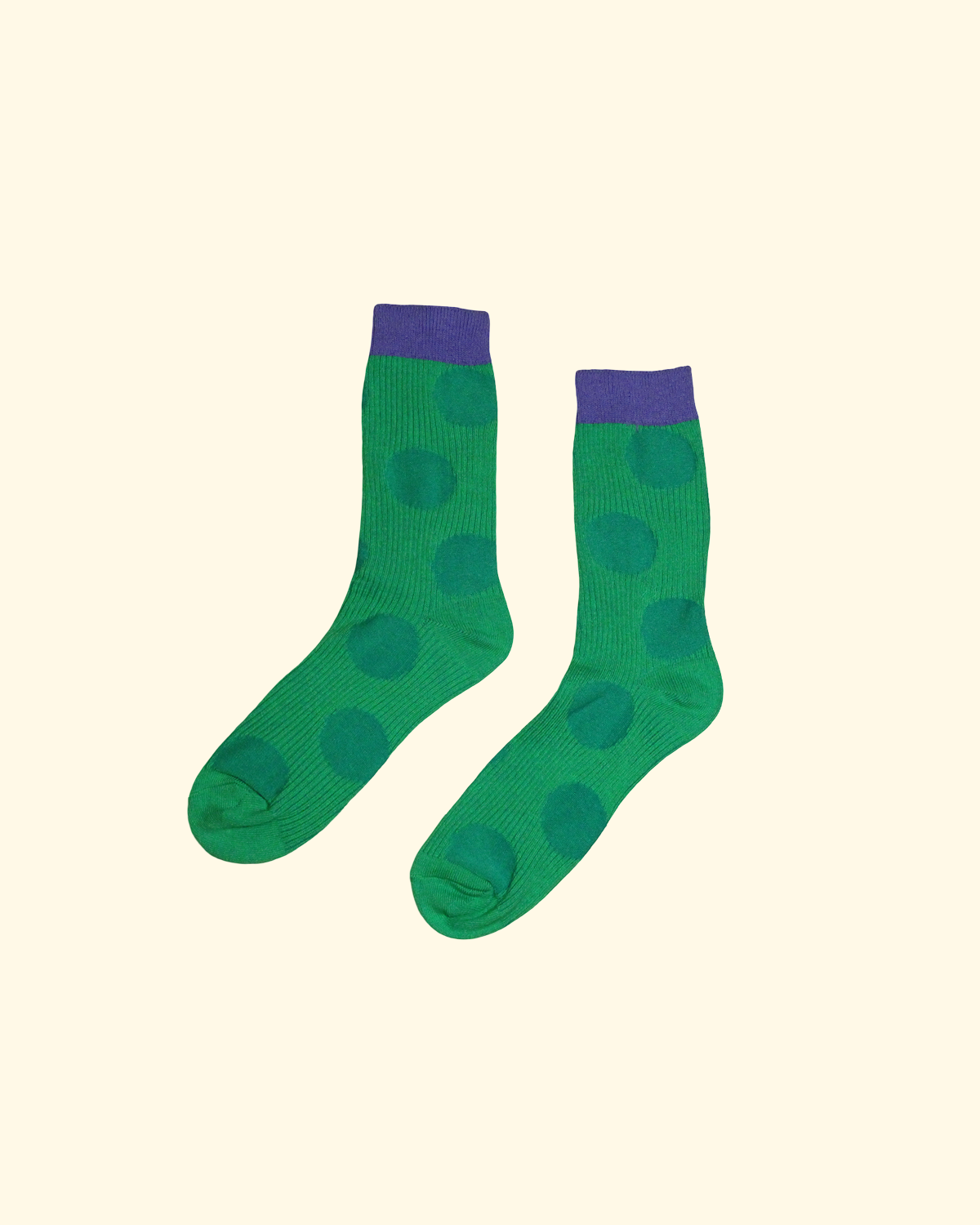 Bring energy to your steps with the Green Bubbles socks, featuring a lively polka dot design in a vivid green base with a bold purple cuff.